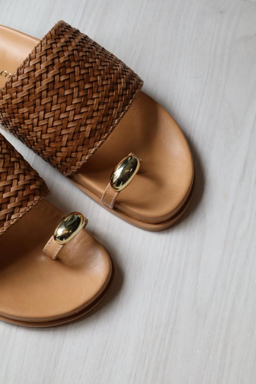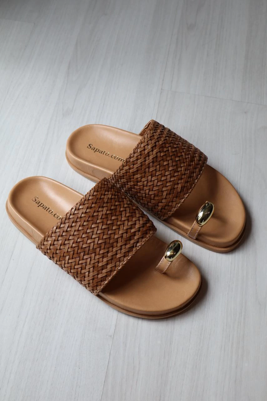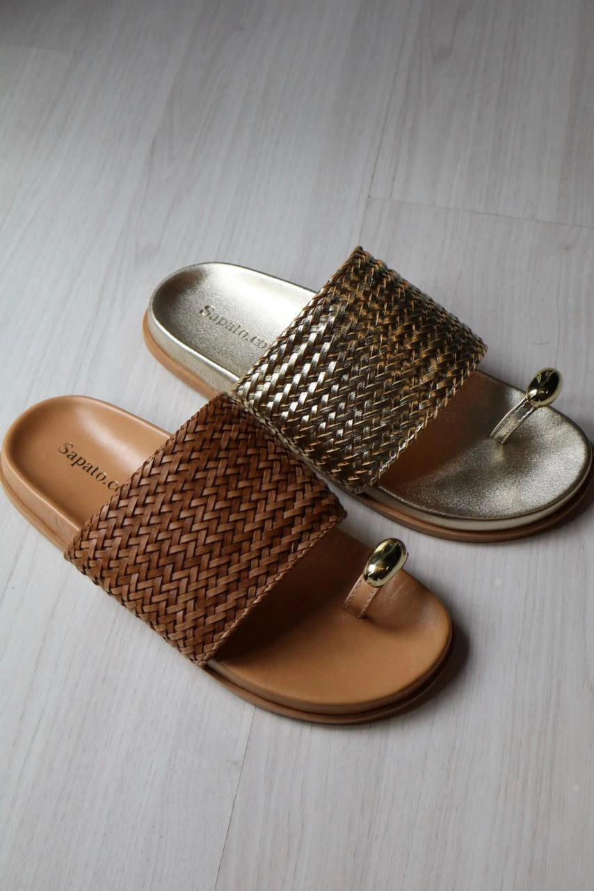 Birken de dedo, com peça ouro (anel como detalhe) ! Cabedal com tira larga tipo 'tressê' tom de Camel
