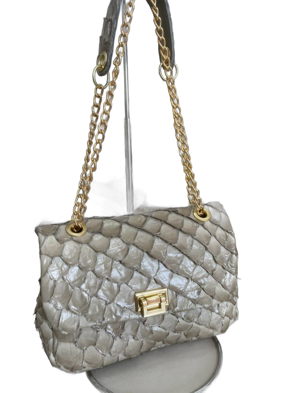 Bolsa Analu M , feita artesanalmente com Pele de Pirarucu tom claro, Amêndoa, com brilho !
