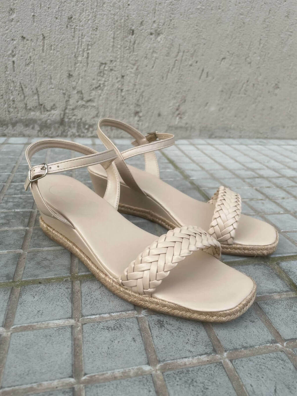 Sandalia Anabela em couro tom claro, Nude claro, com cabedal 1 tira 2 cm trançada sobre os dedos ,