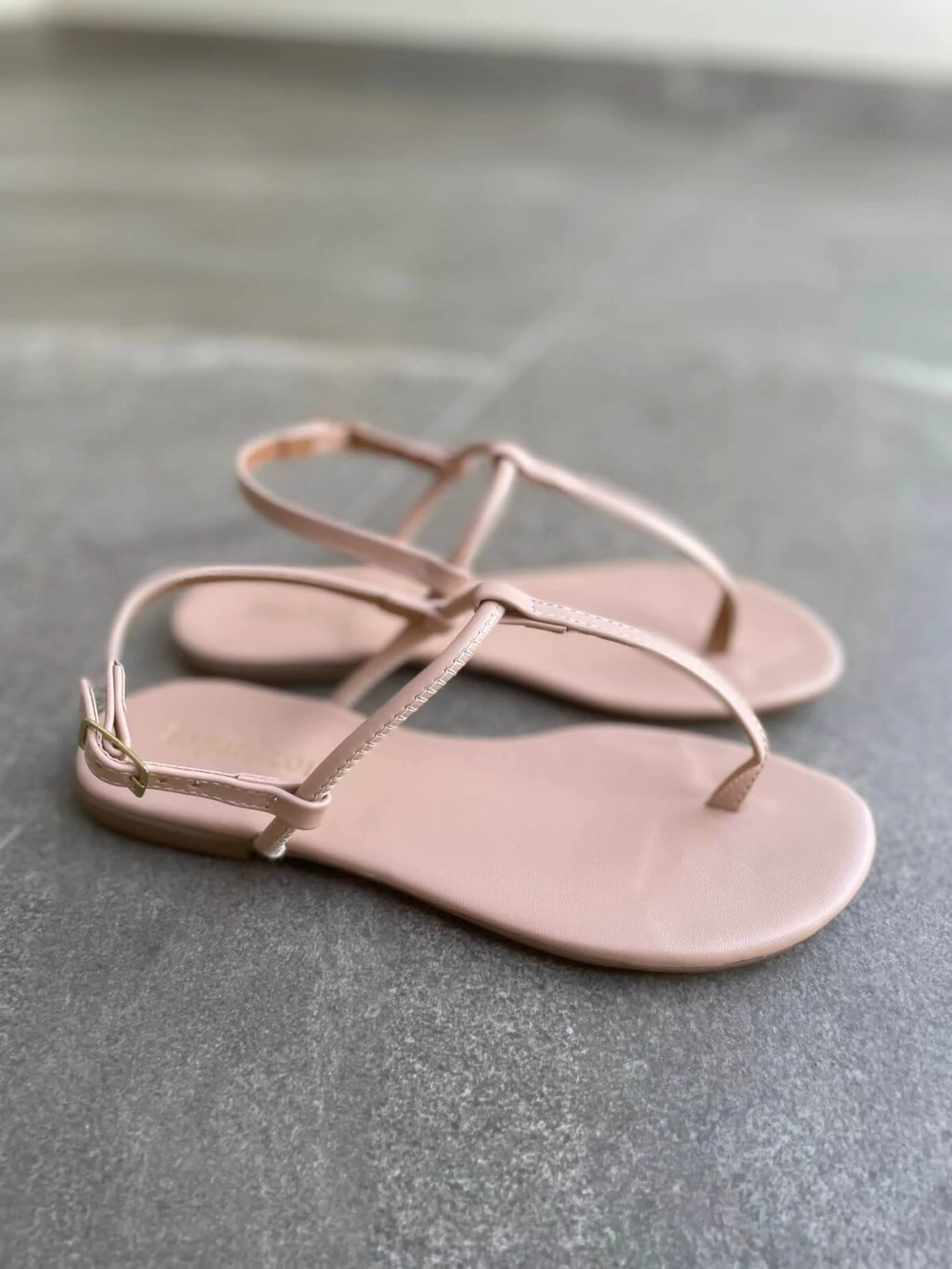 Sandália Rasteira tom claro, Nude, com cabedal tira Única (dedo); e sobre corpo do pé