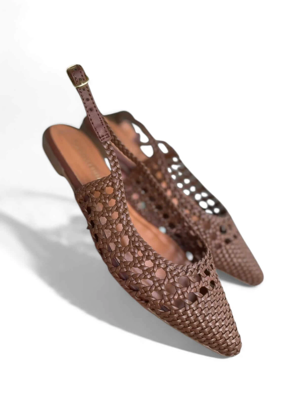 Sapatilha em couro tressê, tom Chocolate, aberta calcanhar - Slingback
